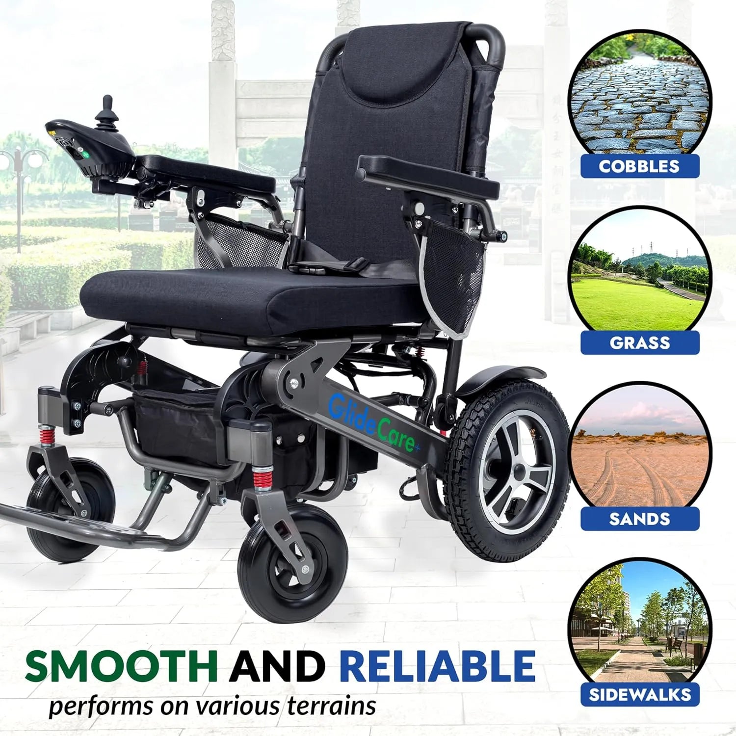 The Glide Care G-6 Foldable Power Chair delivers effortless mobility in a lightweight, travel-friendly package. Weighing just 56 lbs (without battery), it folds easily for transport and fits in car trunks or tight storage spaces.