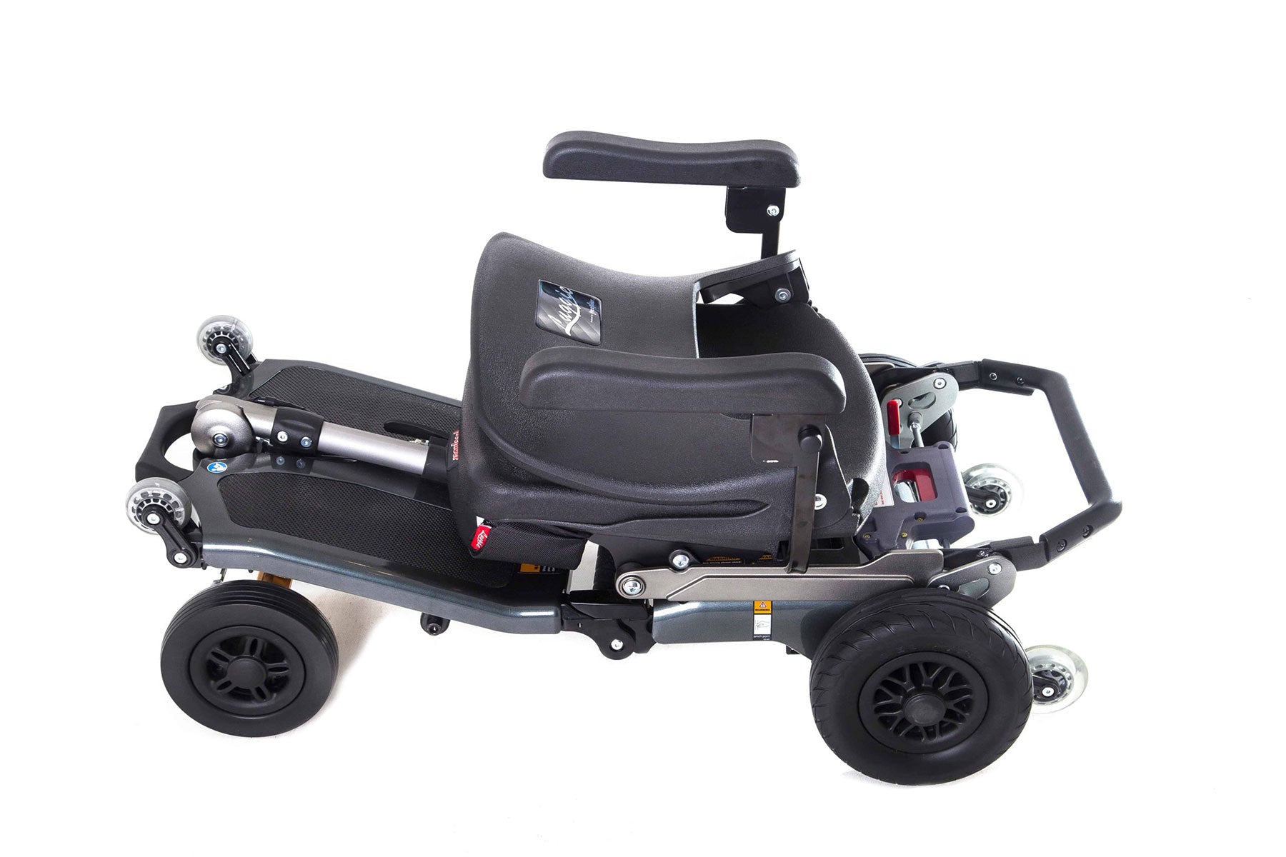 This heavy-duty-folding mobility scooter also features a 17" inch seat, coil suspension and the smallest turning radius of 37". The Luggie Super Plus 4 offers one of the largest carrying weight capacities of any lightweight folding travel scooter on the market today.
