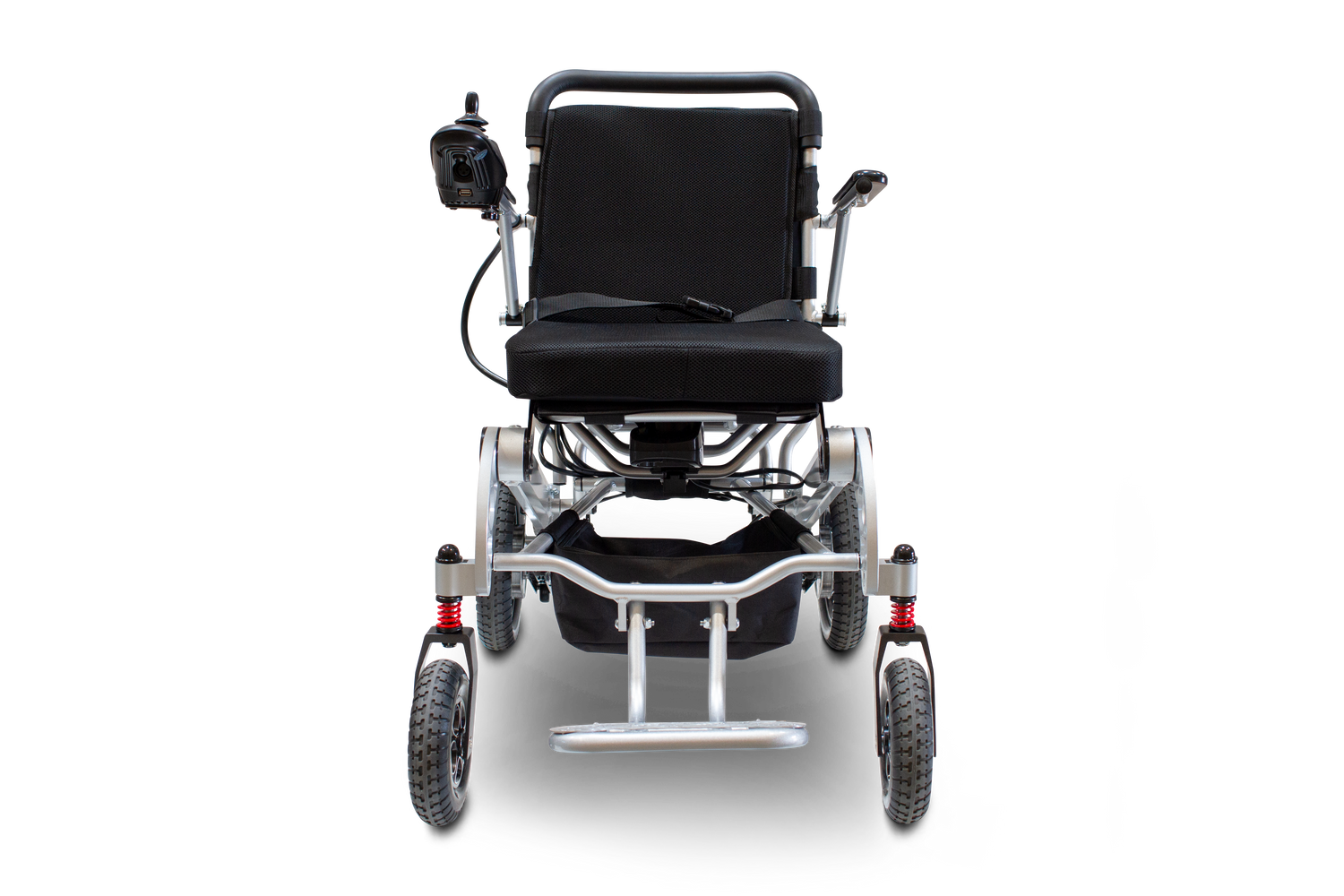 This folding power wheelchair offers under-seat removable storage as well as storage behind the backrest.