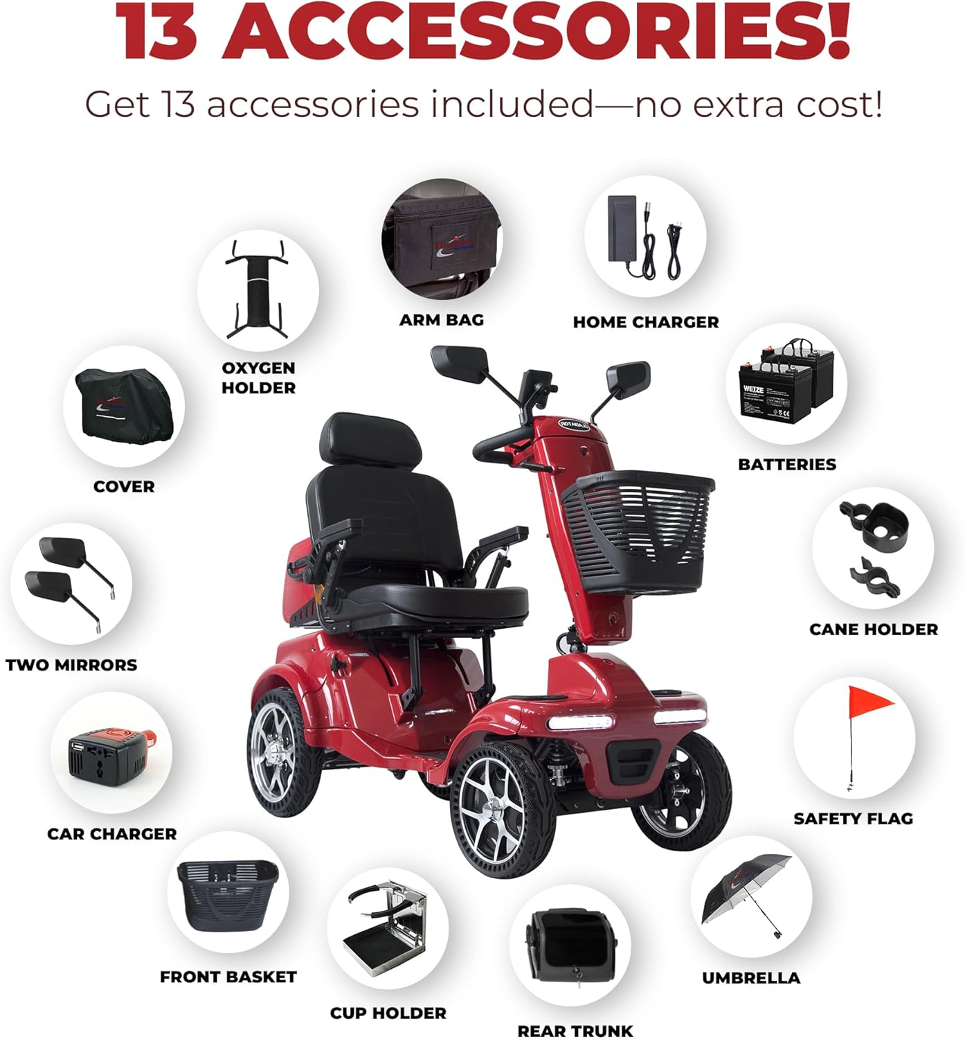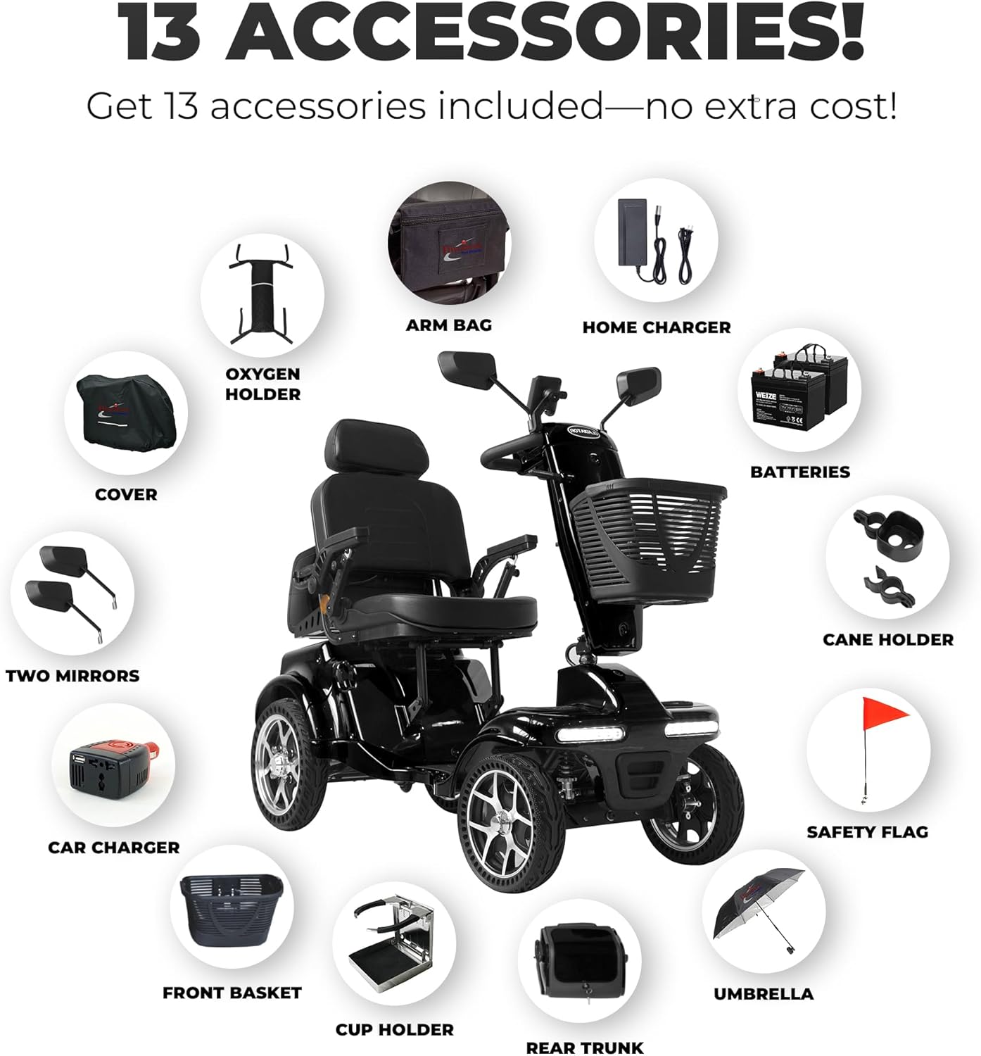• Extra Accessories Included – Comes with a cup holder, arm bag, battery bag, safety flag, mirrors, and more.