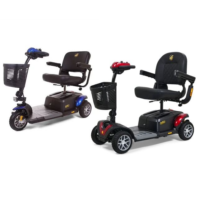 The Golden Buzzaround EX 3-wheel or 4-wheel mobility scooters are a standout among travel scooters, featuring an impressive top speed of 5 mph and a remarkable drive range of 18 miles on a single charge and 350 lbs weight capacity. It is powered by U-1 batteries, ensuring extended performance for long-distance travel.