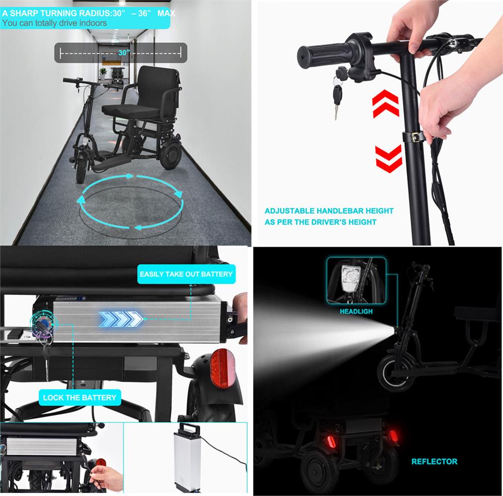 Introducing the new Folding Mobility Scooter by MotoTec. Its compact, three-wheel styling makes for a sharp turning radius, 2 hub motors built into the rear wheels provide amazing torque for riding up inclines with its lightweight durable frame made from Aluminum.